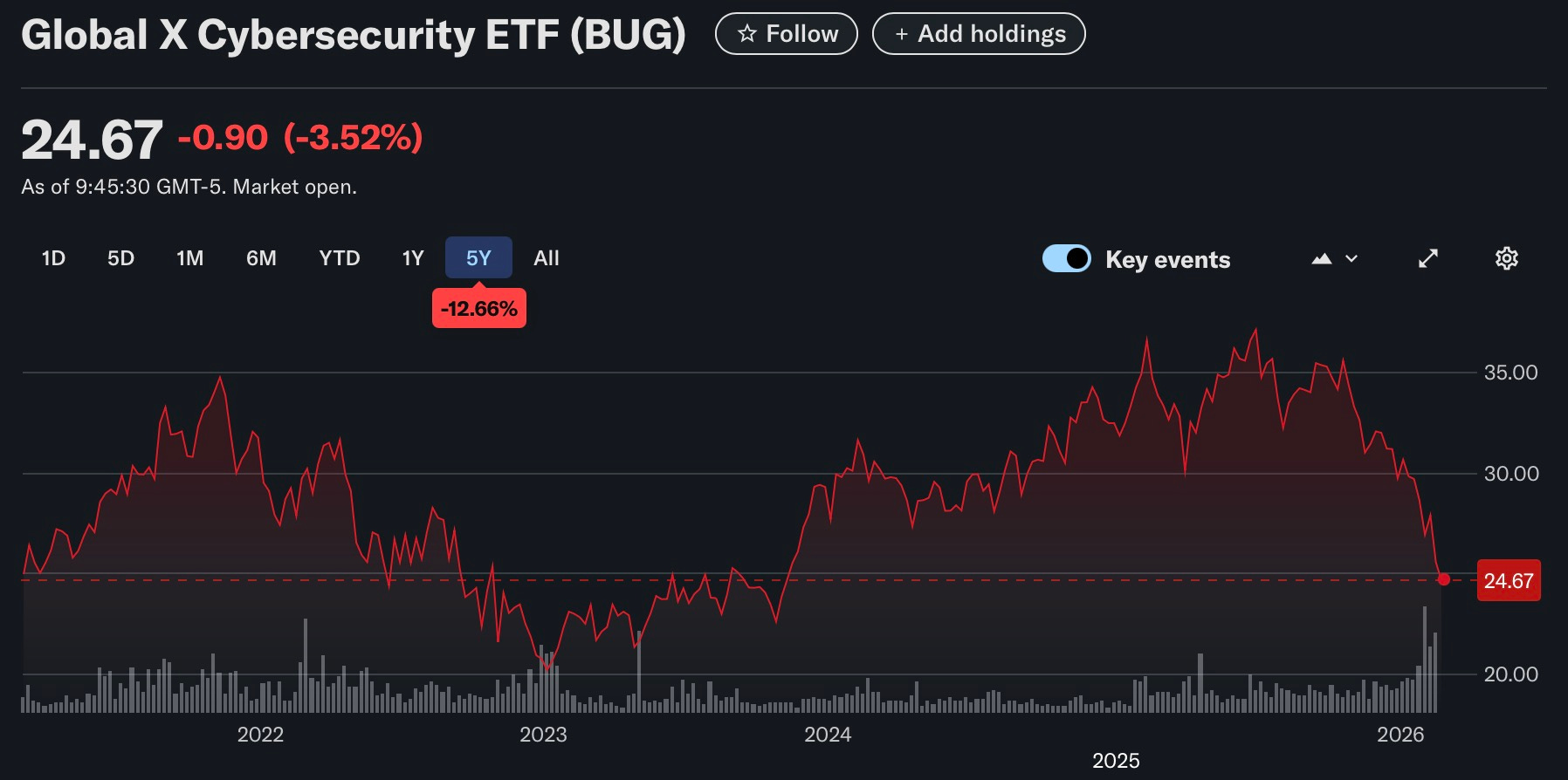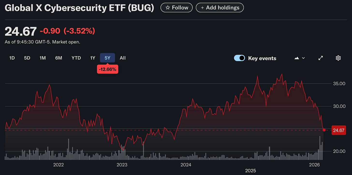 CrowdStrike down 8%. Okta down 9.2%. JFrog down 25%. Cloudflare down 8%. The Global X Cybersecurity ETF hit its lowest point since November 2023.